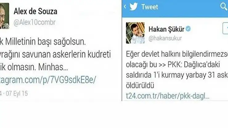 Fenerbahçe'de 8 yıl forma giyen Alex De Souza'nın Dağlıca şehitleri için yayınladığı mesaj sosyal medyayı sallarken, Paralel çetenin baş tetikçilerinden ve ihanet ekibinden olan Hakan Şükür'ün şehitler için 'öldürüldü' kelimesini kullanması 'pes' dedirtti.